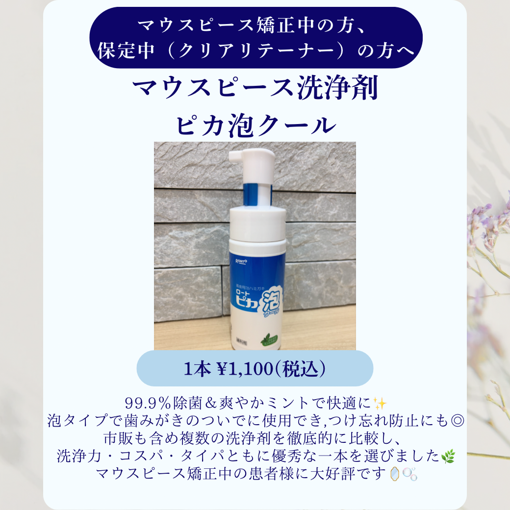 このたび、当院ではマウスピース矯正をされている患者様が快適にお過ごしいただけるように、 新しいマウスピース洗浄剤 「ピカ泡クール」の取り扱いを開始いたしました🫧✨ 皆さまは、マウスピースのお手入れ、どのよう […]